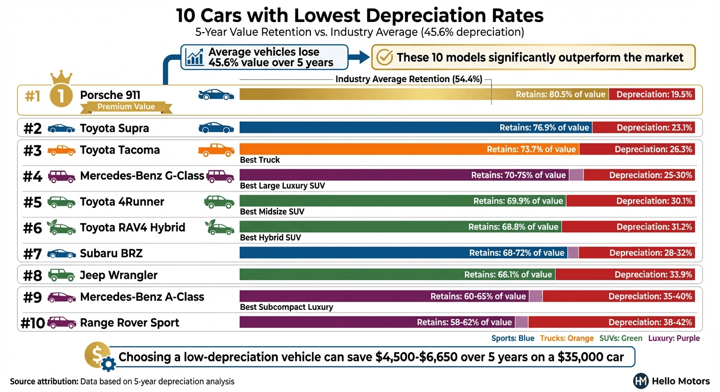 Our analysis of trucks, hybrids, and sports cars shows that choosing models with low depreciation can make a big difference in ownership costs over time. Vehicles like the Toyota Tacoma, which retains about 73.7% of its value, and the Porsche 911, holding around 80.5%, far outperform the industry average, where cars typically lose about 45.6% of their value over five years [3][4]. Whether you’re into trucks, hybrids, or sports cars, focusing on models with strong value retention is a smart move for your wallet.