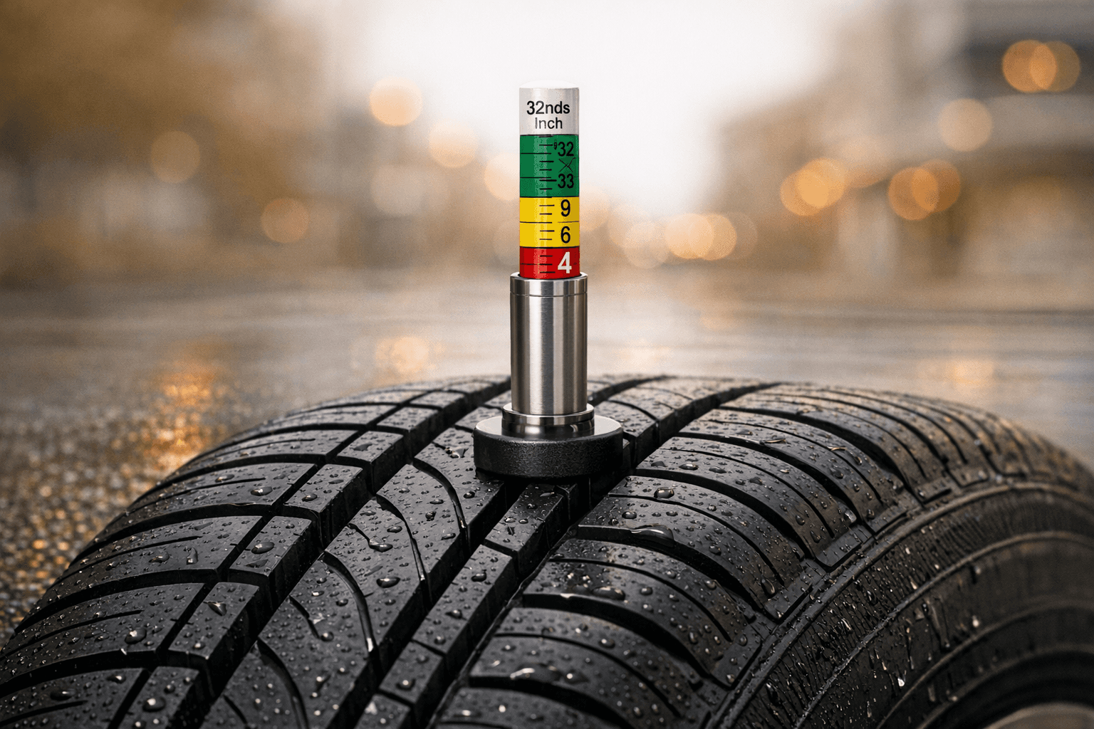 Replace tires at 4/32 inches for reliable wet-weather performance. Waiting until the legal limit of 2/32 inches greatly increases stopping distances and the risk of accidents.